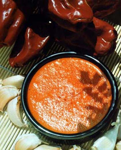 Mettere in un frullatore, o lavorate con lo sbattitore, aglio, sale, e 100 ml d'aceto finché tutti gli ingredienti non saranno tritati